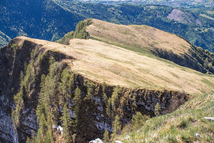 Raggiunta la costa si volge verso nord (con squarci sulla vegetazione che permettono foto verso il M.Talvena e la Cresta dei Tòr) sino a portarsi sul passaggio chiave (in zima Fòrche) m.1390 dove una corda fissa ben piazzata facilita il passaggio della cengia rocciosa che porta alla Pala de i Troi.