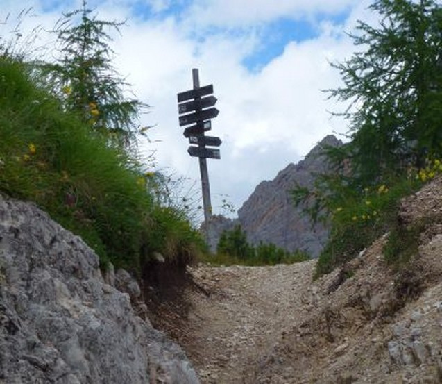 La stradina sale a tornanti superando molti bivii e seguendo sempre le indicazioni per Mietres si giunge con un tratto in discesa al bel prato (Pousa de Zumeles a m.1724) dove vi è il bivio dal quale si prende in salita per sentiero n.204 con indicazione per Val Padeòn. (ore 2.30 dal park).