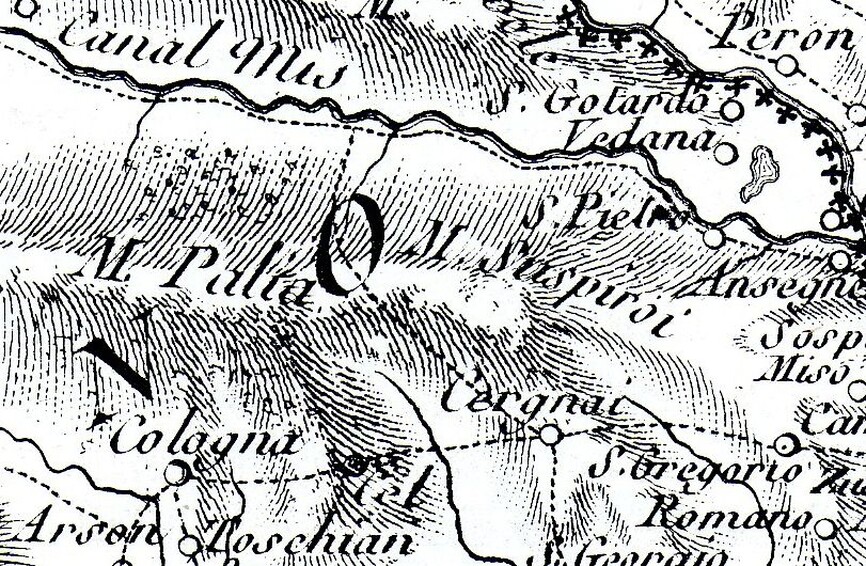 sia come idrografia che come toponimi; appaiono dei tratteggi riportati poi in altre stampe. Molto interessante stabilire se questi tratteggi, in relazione alla data storica, potessero essere confini, sentieri, od entrambi. In particolare si noti il tratteggio che risale la Val del Brenton volgendo poi a sud con una labile diramazione per la Val dei Cantoni (alta Val dei Burt) e più netta per la Val Falcina a nord del 'M.te di Suspiroi'. I monti sono disegnati identici, appare chiaro che il Monte di Palia sia l'odierno M.Pizzocco e questo lo confermeranno ulteriori rappresentazioni grafiche .