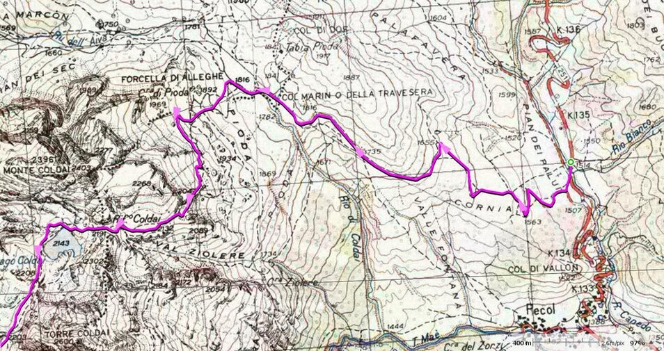 Traccia GPS riportata su IGM 1:25000 levata 1948 Il sentiero che scende per il van delle Nevere e' segnato