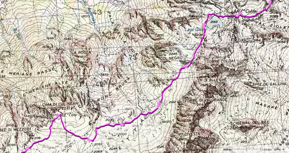 E’ un itinerario classico di circa 25 Km che prevede un pernottamento al Rif.Tissi. Il dislivello in salita si compie il primo giorno ed è di circa 1000 mt. Il secondo giorno la salita si limita a 140 mt. circa nentre la discesa è di circa 1600 mt. Il tempo di percorrenza il primo giorno è di circa 6/7 ore e la discesa nel secondo giorno impegna per eguale tempo. L’intero percorso è adatto anche a bambini, comunque allenati e con frequenti soste. Volendo essere pignoli, il tratto ove va prestata molta attenzione è l’arrivo al Rif. Coldai, sui 5 tornantini rocciosi con ghiaino infido.