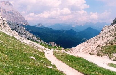 La discesa prosegue per la stradina ghiaiosa (sent.nr.555) che lascia a sx il ‘Pian delle Taie’ con il sentiero nr.558 che sale al ‘Van delle Sasse’. Il percorso alla quota di mt.1430 presso un tornante lascia a sx il bivio della Alta Via nr.1 e discende ancora sei tornanti sino ad attraversare per passerella metallica il torrente Corpassa a mt.1289. Si perviene alla Capanna Trieste dopo aver attraversato ancora il torrente a mt. 1135 su fondo stradale asfaltato.
