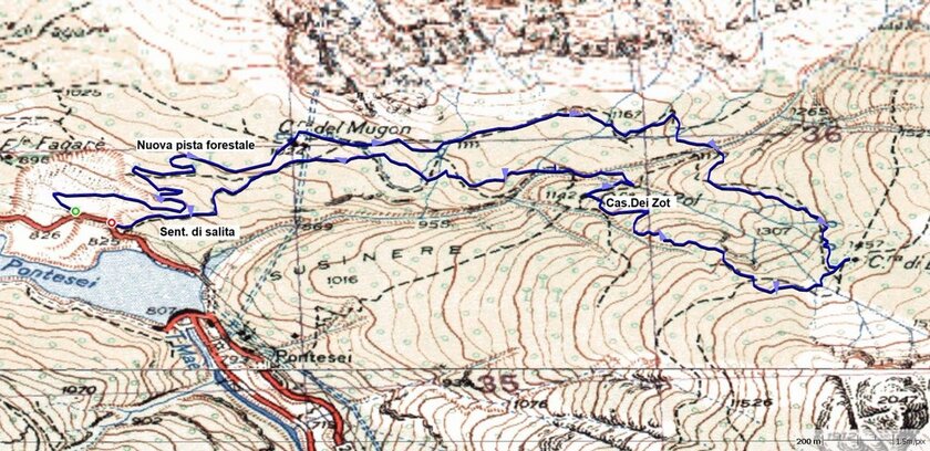 Il bivio sulla pista forestale a 1130 mt. Questo percorso da qui segue la piata forestale per chi vuole godere della freschissima acqua della ex Malga del Mugòn che si raggiunge a quota 1030 circa. La ex malga si compone di due fabbricati: uno grande era adibito a stalla, Uno più piccolo a lavorazione del formaggio. E’ presente una fontana molto lunga per il bestiame dalla quale sgorga ottima acqua . Proseguendo in discesa con 8 tornanti si perviene al park di Pontesei in circa mezz’ora.
