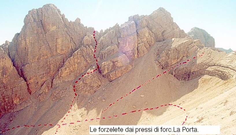 Si cala per sentiero rasente alle crode e si perviene ad una forcella sita piu' in basso della forcella Bela.