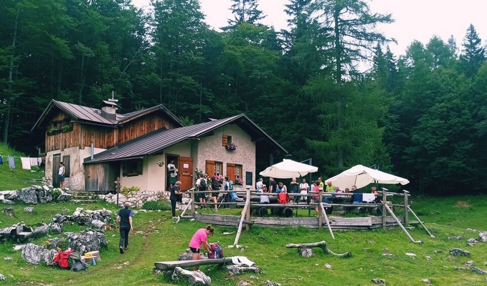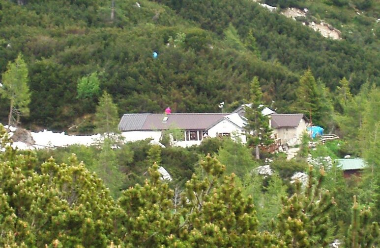 Il complesso di edifici del Rifugio 'Tita' Sommariva al Pramperèt visto dalle alture delle Balanzole.