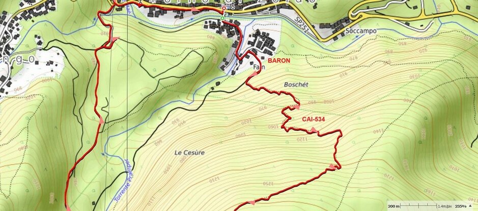 Descrizione del percorso in salita affisso presso la segnaletica del ponticello di legno che si inoltra nel bosco sopra all'abitato di Baròn.