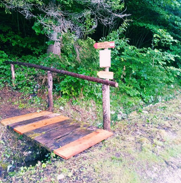 al limitare del bosco, il ponticello con segnaletica ove è affissa la descrizione del percorso CAI nr.534