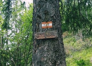 La segnaletica presso il ruscelletto della Malga di Mezzodì ed il nome dato al sentiero nr.525 che scende : 'Triol del Spissàndol o triol del Castelàz.