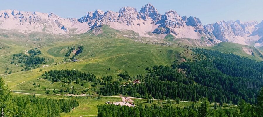 Panorama dalla vetta: a sx la strada per Baita Segantini e P.sso Rolle a dx il M.Castelàz, sfondo i Lagorai
