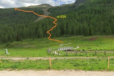 La casera di Focobòn a m.1894 L'inizio è ad un centiaio di metri a sud del Camping Eden di Falcade presso un park gratuito (Monumento all'esploratore Maggiore H.W. Tilman che combattè assieme ai partigiani durante l'ultimo conflitto mondiale)