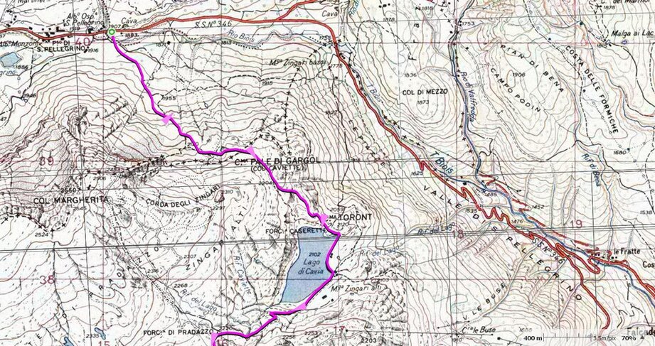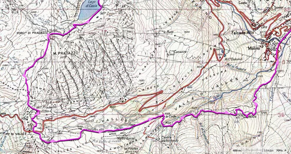 Ritaglio da: cartografia TABACCO n.15 - 1:25000 GPS-UTM - Marmolada-Pelmo-Civetta-MoiazzaE' un percorso di alta quota dolomitica che dipartendosi da Gares (mt.1381) tocca i 2814 metri di altezza al passo delle Farangole e scendendo al rif. Mulaz (mt.2571) supera anche la forcella della Stia (mt.2190) compie un anello ritornando nuovamente a Gares.