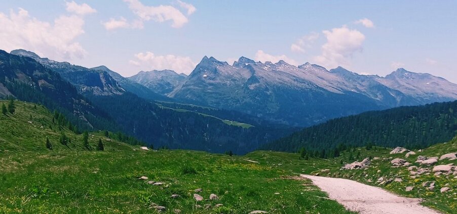 sotto: pascoli e malghe di Juribello, Castelaz: sopra: Focobon, Cima Vezzana e Cimon della Pala