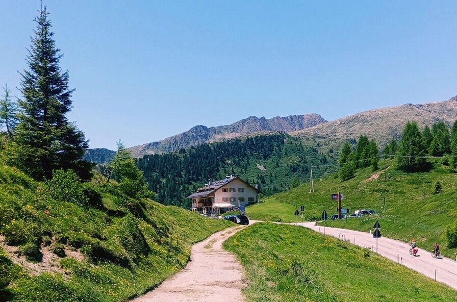 Si segue ancora la pista in salita (ma c'è una scorciatoia che risale dritta ad est) pervenendo al passo Costazza ed al rif. Baita Segantini a quota m.2170.