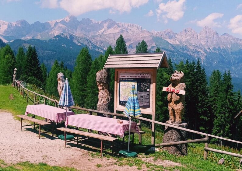 NB. Di interesse culturale il monumento alll'esploratore H.W.Tilman (dove la pista si raccorda con la strada, presso il campeggio Eden, trenta metri a nord, sulla piazzetta dove si parcheggia per il rif. Mulaz). Il Museo dedicato allo scultore e pittore Augusto Murer è sito trenta metri a nord del parcheggio della seggiovia - si vedono le sculture all'aperto.